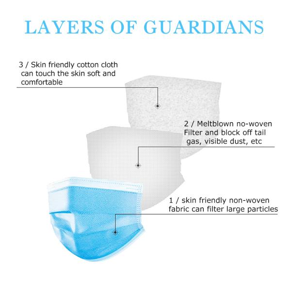3-ply structure: outer layer and inner layer are soft and comfortable non-woven fabric; middle layer is high quality melt blown fabric.